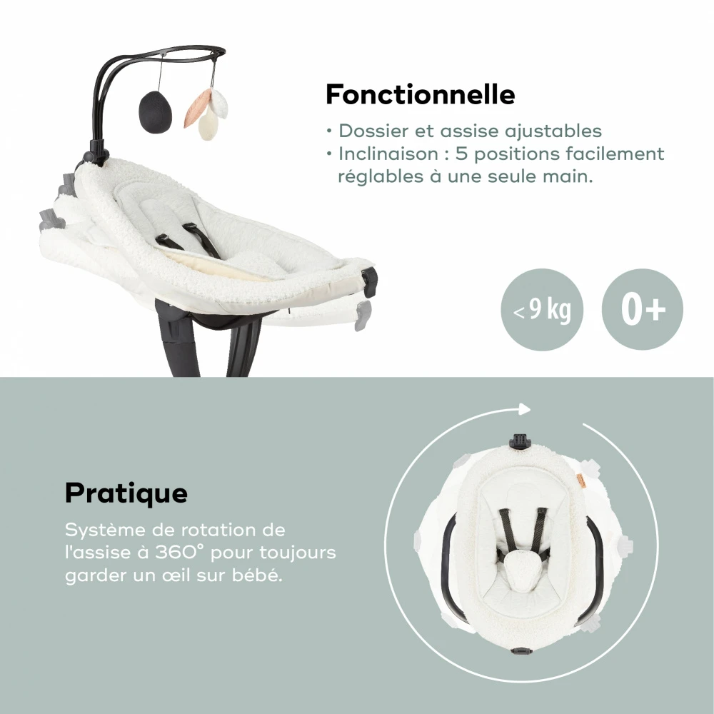 La Balancelle swoon evolution curl white de Babymoov combine technologie, sécurité et confort. Adapté aux nouveau-nés grâce à son coussin réducteur et son harnais de sécurité; le tissu tout doux en bouclette en font un vrai nid douillet. Innovante, elle offre un système de rotation de l’assise à 360° et 5 positions que vous pourrez régler à la main. Grâce à sa télécommande, vous pourrez régler à distance vitesse, mouvements et les 12 mélodies intégrées. La balancelle possède entre autre une arche et 3 jouets sensoriels pour amuser bébé et se déhousse pour un entretien facile.