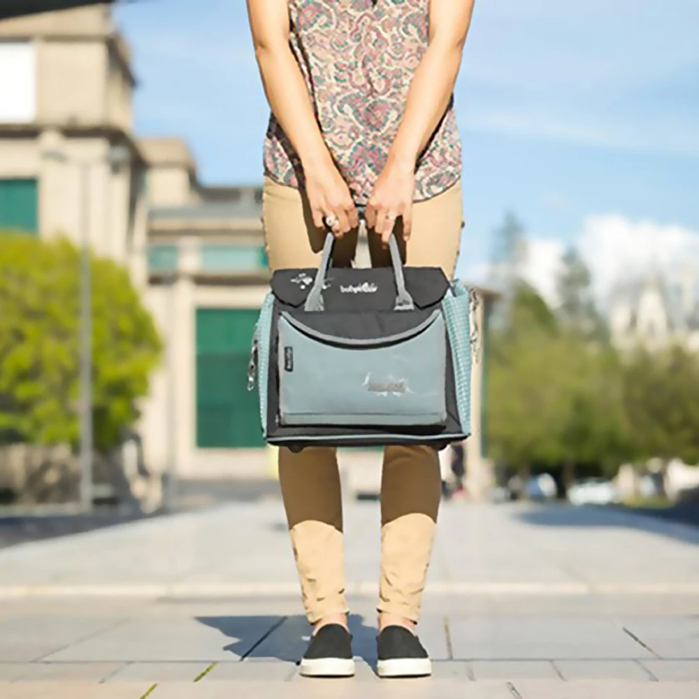 Sac à langer ultra fonctionnel et tendance qui s’adapte à chaque type de sortie!Le plus produit:Des sacs qui s’utilisent d’une seule main, pour tous les styles de mamans!Le sac à langer baby style contient:- Pochette à langer amovible avec plan à langer (55 x 45 cm)- Housse de biberon isotherme amovible avec attache universelle- Housse transparente pour couche ou linge sale- Housse sucette avec attache universelle- Couverture polaire- Attaches poussette réglables universelles- Multiples compartiments et poches de rangement- Possibilité d’utiliser la bandoulière sur la pochette à langer et la housse isotherme- Fond renforcé- Fermoirs métalliques- Confort de portage: bandoulière molletonnée réglable et poignées de transportDimensions: 27 x 36 x 20 cm