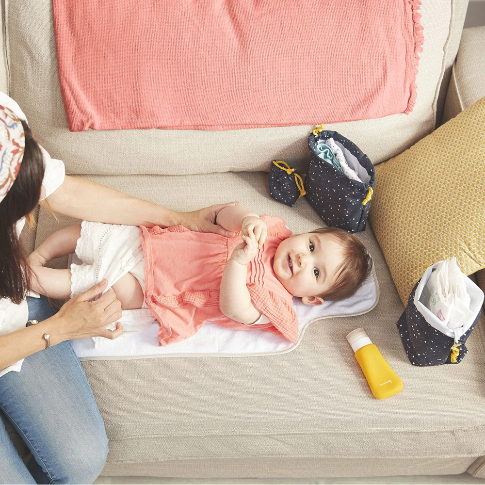 - COMPLET : le kit à langer contient tous les accessoires essentiels du change : – 1 grande pochette avec plusieurs poches intérieures dont 1 zippée- 3 pochons de tailles différentes pour la sucette, les cotons, les couches ou le linge- 1 matelas à langer compact et confortable grâce à l’intérieur en éponge, au pliage hygiénique- 1 petite bouteille vide en silicone pour le liniment ou tout autre produit d’hygiène