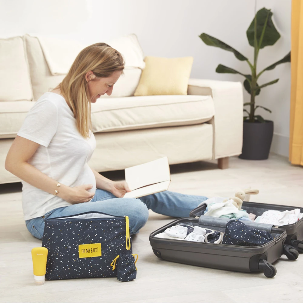 - Evolutif et multifonctons : en fonction de l’âge de votre bout de choux, le kit à langer se transforme en trousse de toilette et pochettes de voyage