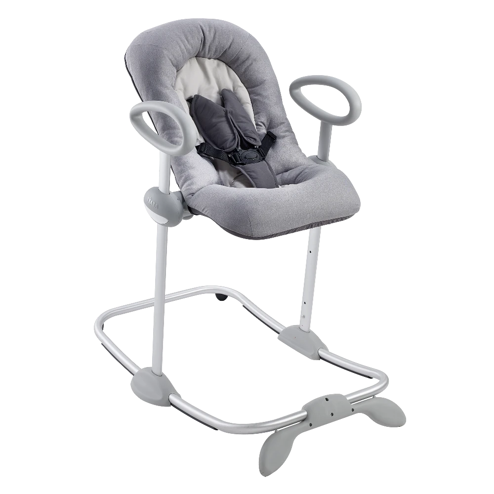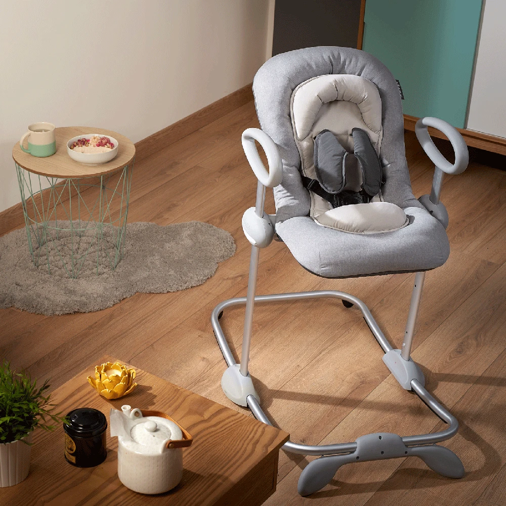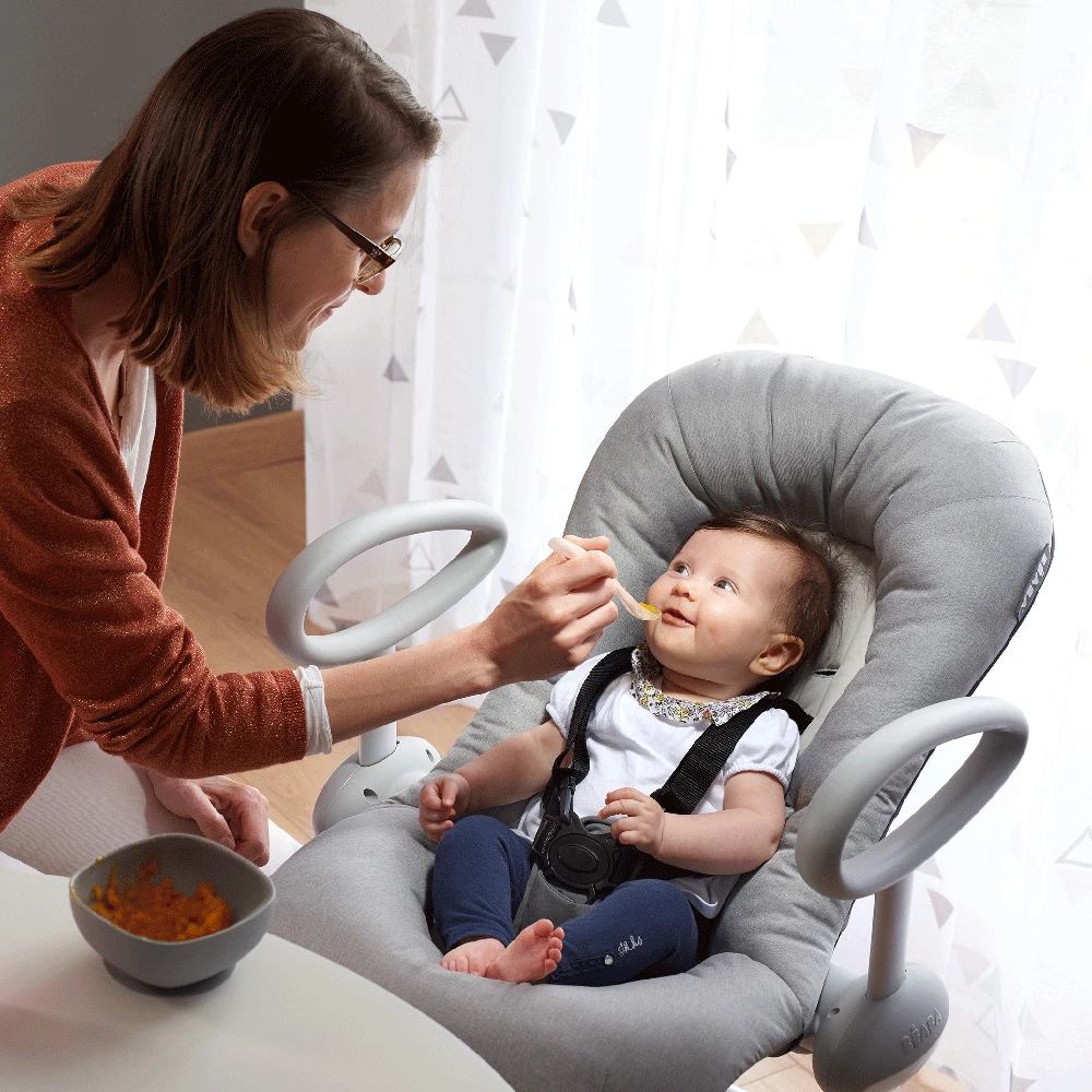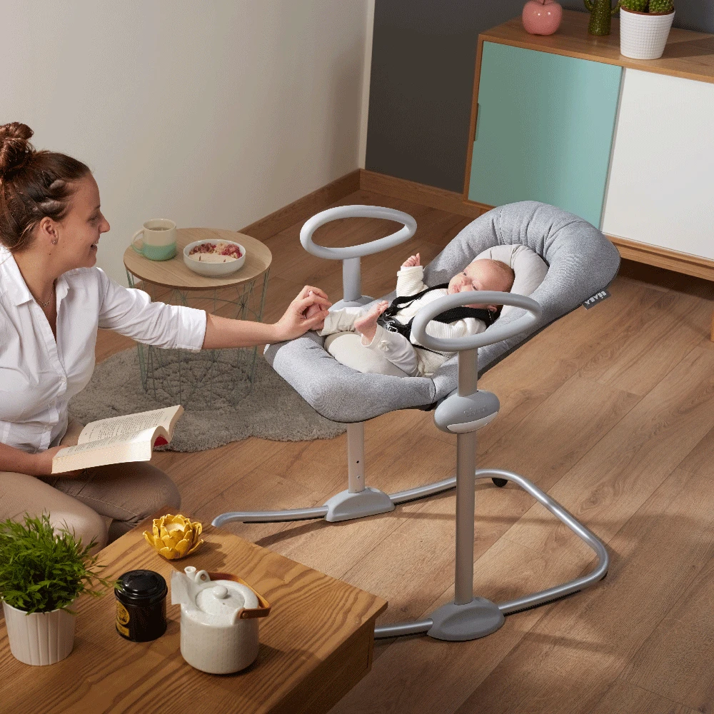 La fonction bascule permettra de bercer bébé pour le soulager, le rassurer ou l’endormir. La sécurité sera assurée par un frein intégré. Ses poignées de transport offrent la possibilité de déplacer facilement le transat de pièce en pièce.