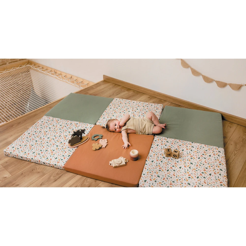 Le Tapis de motricité xl terrazzo de chez Candide. Ce tapis offre une grande surface de jeux. Le tapis malin est évolutif. Il servira de tapis de jeux à votre bébé. Plié en trois votre bébé pour l’utilisé comme couchage. Parfait pour les voyages. Vous pourrez le transformer le pouf également. Votre enfant pourra jouer dans une cabane et s’inventer un monde. La transformation en tunnel aidera au développement de la motricité.