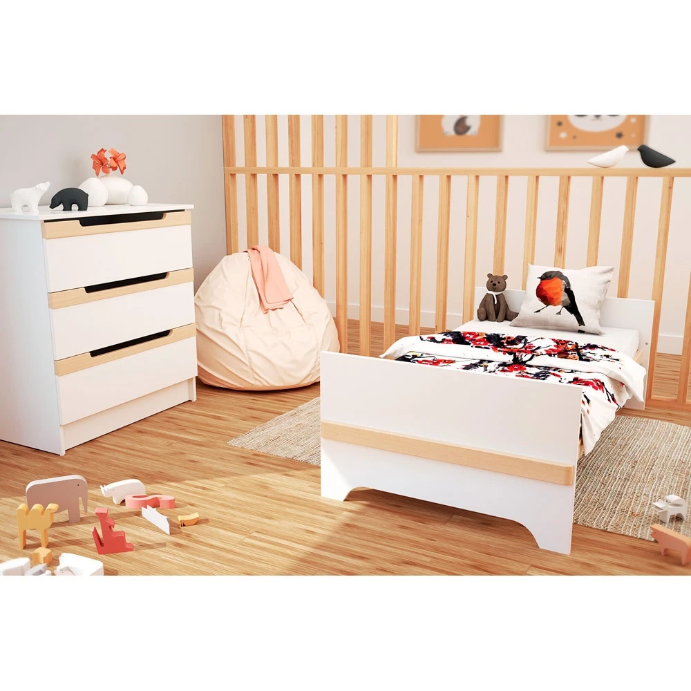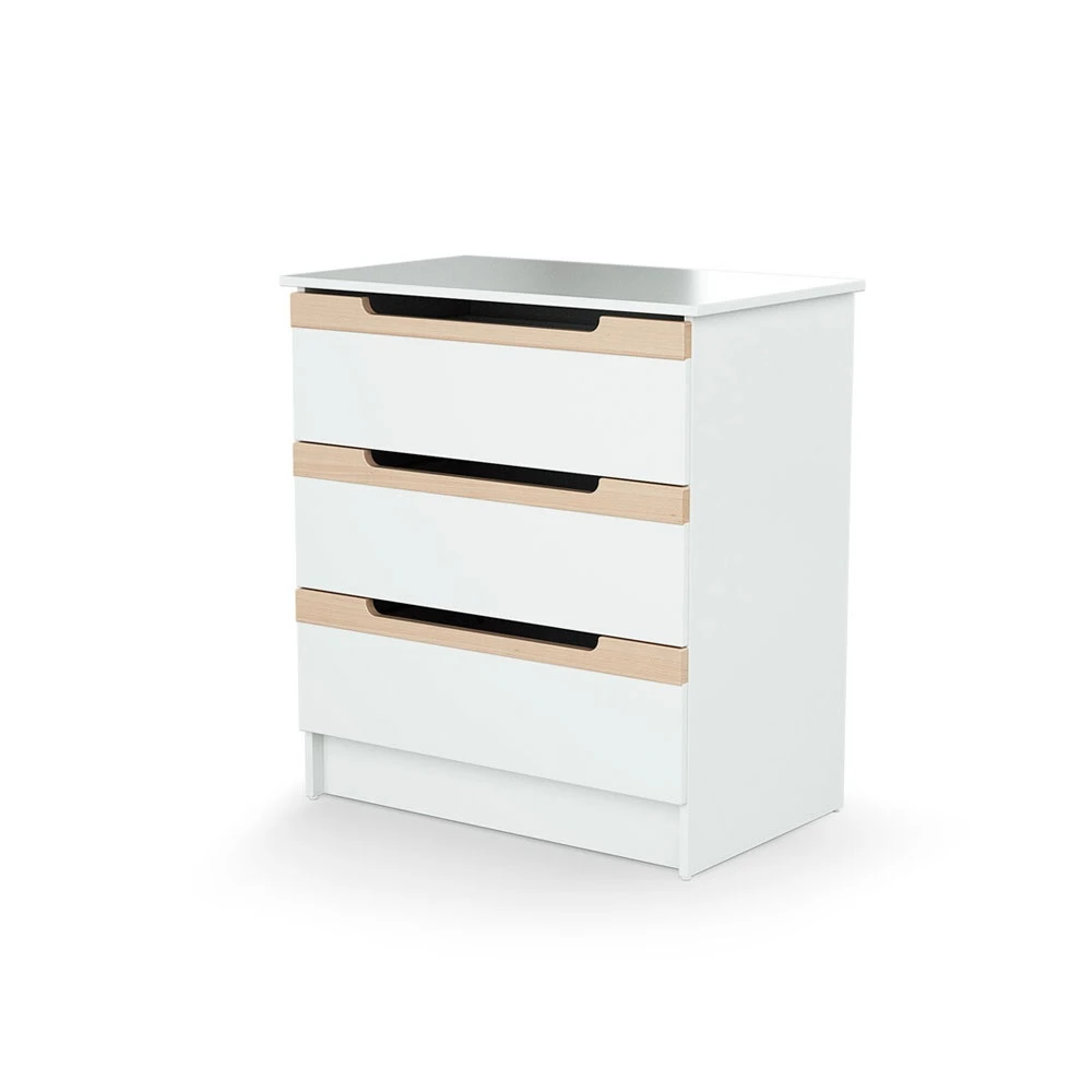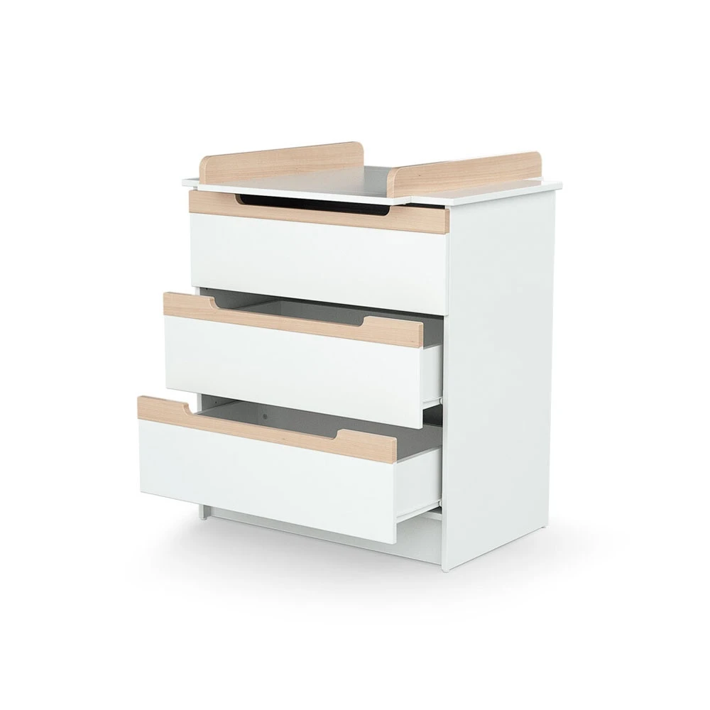 La Commode à langer carrousel blanc et hêtre verni de chez AT4 ! Vous pourrez utiliser le plan à langer dès la naissance de votre enfant jusqu’à 12 mois environ soit jusqu’à 11 kg maximum. Elle allie un design scandinave avec une utilisation pratique ! Cette commode à langer possède 3 tiroirs et un plan à langer amovible, pour évoluer en même temps que votre enfant. Ainsi vous pourrez changer votre enfant en ayant tous le nécessaire à portée de main.