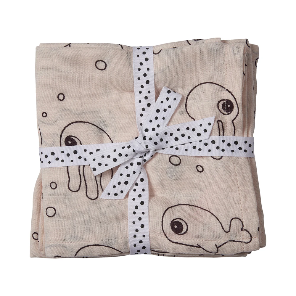 Un ensemble de deux langes en mousseline douce de couleur pastel sur le thème de la mer avec des petits poissons et des pieuvres