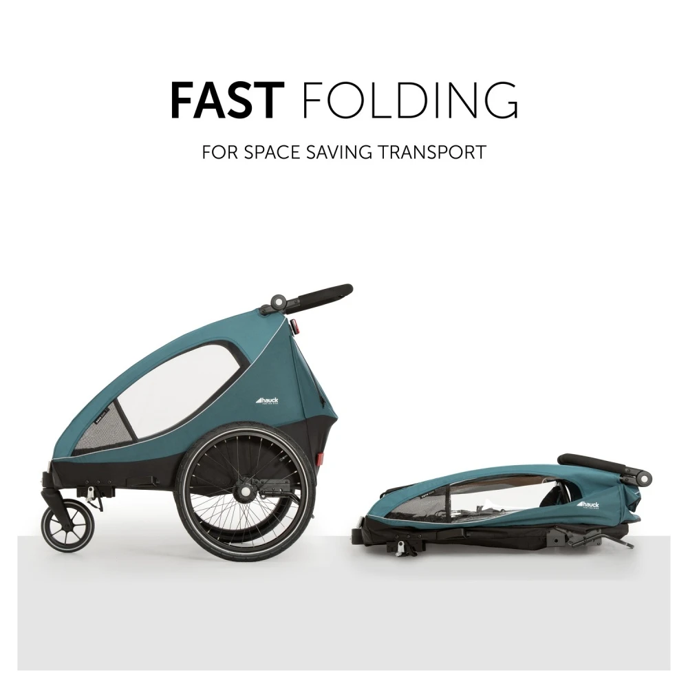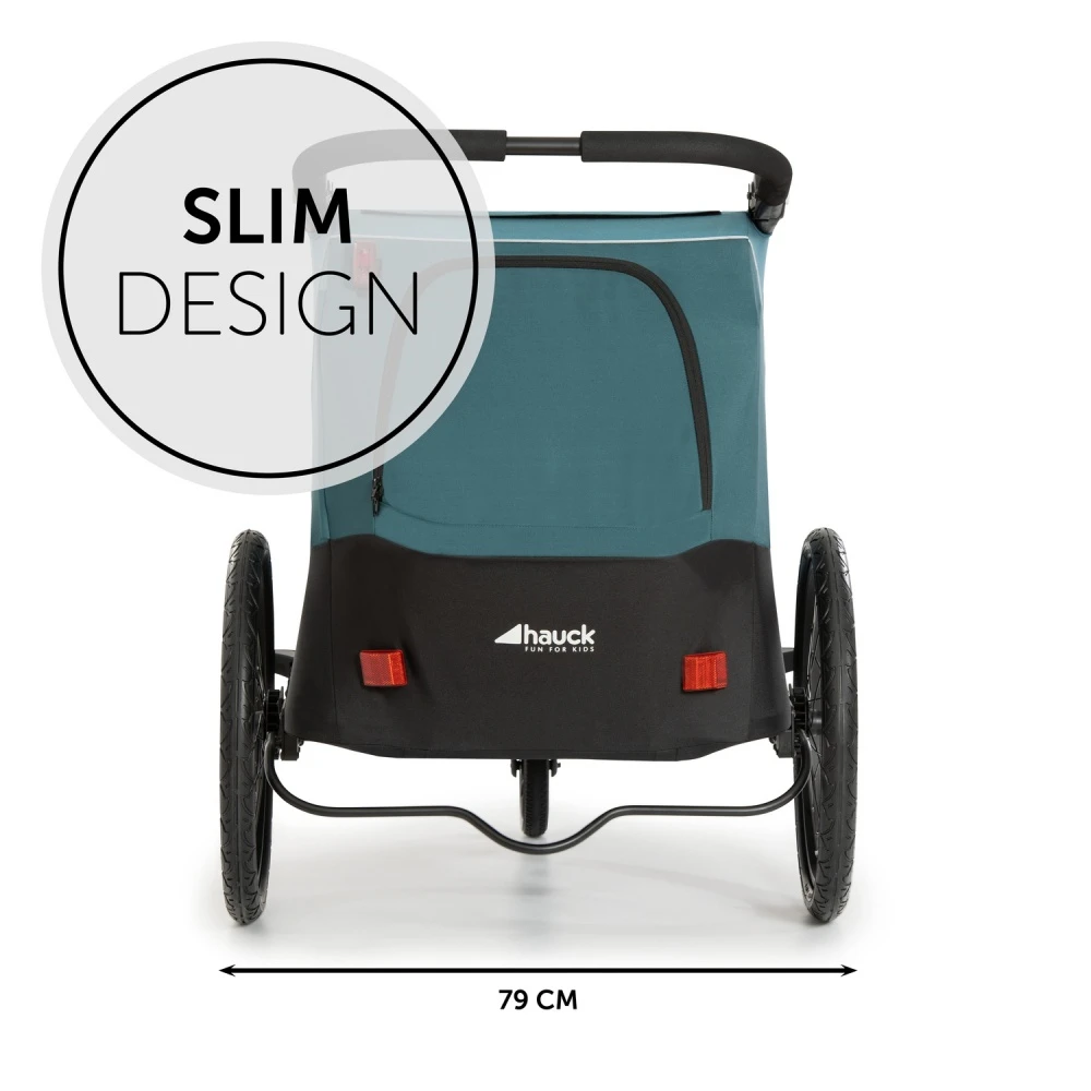 Le chariot Dryk Duo Petrol de la marque Hauck. Utilisable pour les enfants de 6 mois à 4 ans. C’est la remorque idéale pour les promenades avec 1 ou 2 enfants. Vous pourrez le fixe à votre vélo pour vous déplacer en famille ou encore transformer le chariot en poussette. Le chariot Dryk Duo est la poussette multifonctionnelle à avoir ! Sur la route, vous ne sentirez pas les tremblements grâce au siège rembourré qui apporte un maximum de confort sans compter l’habitacle à température contrôlée…mais aussi la moustiquaire lors de vos balades en été le long de la mer ou le long d’un lac ! Arrivée à destination, pourquoi ne pas se faire un petit pique-nique que vous aviez préparé et soigneusement rangé dans le coffre de contenance 6 kg maximum. Puis ne vous inquiétez pas, le chariot possède un feu arrière afin d’être visible. Un conseil, vous pourrez nettoyer me chariot avec de l’eau uniquement et quelques produits d’entretiens ménagers. Surtout n’utilisez pas de produit corrosif.