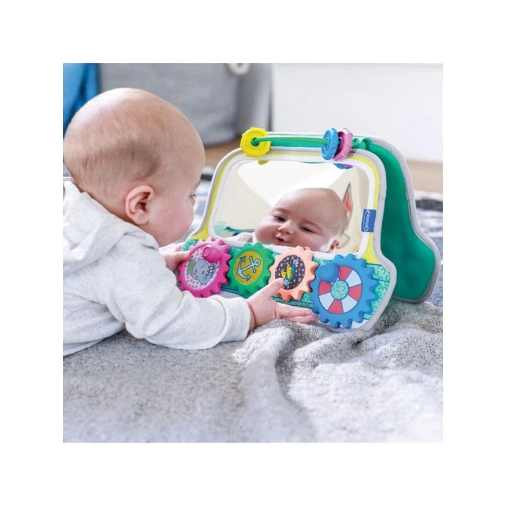 Le Miroir d’activités 2 en 1 de chez Infantino. e jouet d’éveil sensoriel en forme de bateau permet le développement de la motricité et de la dextérité avec son jeu d’engrenage et de perles.