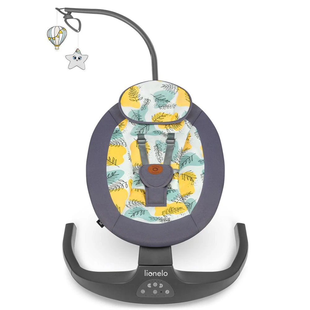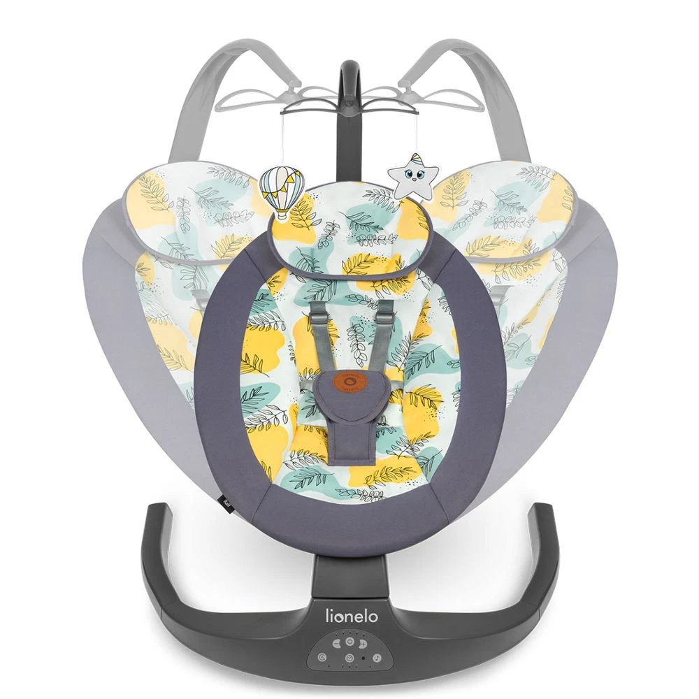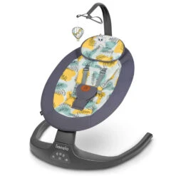 - Fonctionnalités : Rotation du siège à 115°; carrousel électrique avec un projecteur ; 5 vitesses de bercement ; 12 mélodies et sons de la nature ; adaptation de la plage de bercement au poids