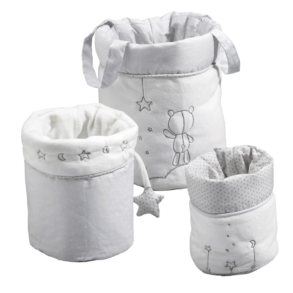 Laissez-vous séduire par les panières gigognes Céleste : parfaites pour un cadeau de naissance, elles seront très utiles pour ranger tous les produits de soins sur la table à langer.