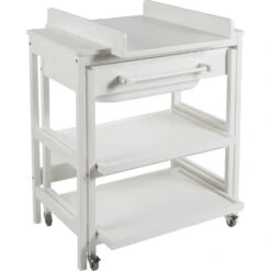 La Meuble de bain bébé smart white de chez Quax. Ce meuble ingénieux, 2-en-1, sera parfait pour votre salle de bain. Le meuble possède une base fixe qui fait office de table à langer. En-dessous se trouve un meuble roulant avec une baignoire bébé intégrée ainsi que deux étagères coulissantes. La table à langer avec baignoire est adaptée pour un bain en toute sécurité.