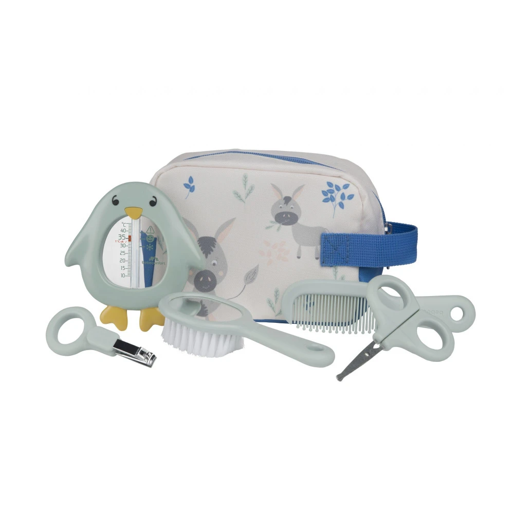 Découvrez ce set de toilette de la collection Lovely Donkey de chez Bebeconfort. Cette jolie trousse Bebeconfort est constituée de tout le nécessaire de toilette dont bébé a besoin : un thermomètre en forme de pingouin , une brosse avec un mirroir intégré à l’arrière, un peigne à dents arrondies, un ciseaux et un coupe-ongles. Ce kit est idéal pour votre enfant afin de prendre soin de lui dès sa naissance. Grâce à cette trousse pratique et complète, vous ne serez pas encombré de produits partout et vous pourrez vous occuper de votre petit bout en déplacement tout comme à la maison. Indispensable au quotidien, elle sera facile à transporter avec sa anse sur le côté !