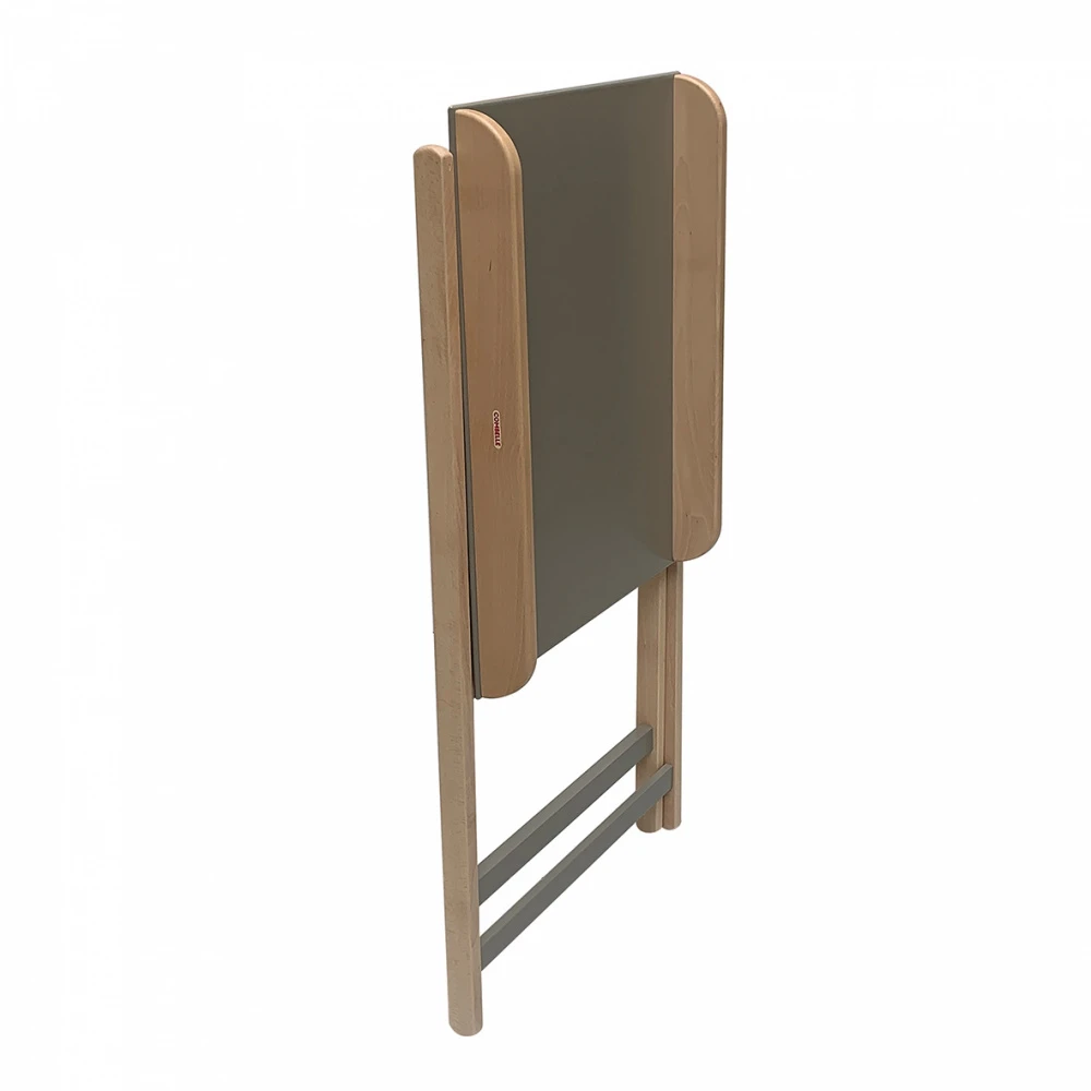 Dimensions : 55 x 82 cm ; 2 hauteurs de réglage: 87 et 94 cm. Table pliée, épaisseur 12 cm.