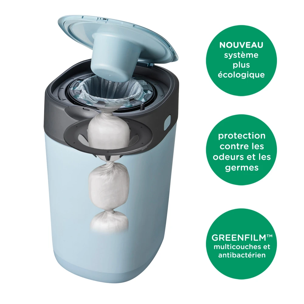 La poubelle à couches Twist & Click est la seule poubelle qui tourne et emballe individuellement chaque couche dans un film antibactérien Greenfilm multi-épaisseurs, afin d’isoler les germes, les microbes et les odeurs des couches sales. Les sacs sont fabriqués à partir de canne à sucre exploitée de manière durable.