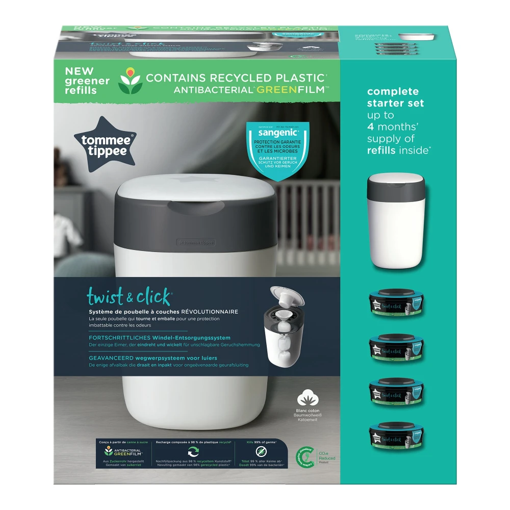La poubelle à couches Twist & Click est la seule poubelle qui tourne et emballe individuellement chaque couche dans un film antibactérien Greenfilm multi-épaisseurs, afin d’isoler les germes, les microbes et les odeurs des couches sales. Les sacs sont fabriqués à partir de canne à sucre exploitée de manière durable.