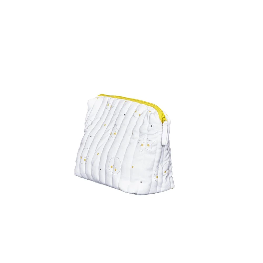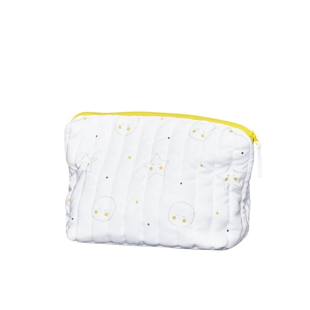 Cette Trousse de toilette bébé babyfan en mousseline de coton bio est idéale pour y glisser l’essentiel pour la toilette et les soins de bébé lors de vos déplacements. Le tissu intérieur est déperlant et se nettoye facilement d’un coup d’éponge.